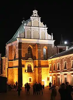 The chapel was most likely constructed before 1326, when it was part of the castle complex.[3] In the 14th century, it was a single-storey building with a crypt. It possessed a nave, as well as a polygonal presbytery, which was contained within the circumference of the castle's defensive walls. In 1407, the chapel was rebuilt in the gothic style by order of King Ladislaus II Jagiello (Jogaila of Lithuania). After increasing the height of the walls, the chapel became a two-storey structure, maintaining the old crypt. The form of the church was dominated by two steep step-patterned gables which survived until the 1650s. The lowest level of the building was designated as a crypt for deceased chaplains and local administrators, while the upper levels were used for religious services. The polygonal presbytery as well as the square nave were rib-vaulted. The vaulting of the nave was supported by a centrally-planned pillar. This structural element was typical for the sacral and secular architecture during the reign of Casimir III the Great. During the Renaissance, the church maintained a gothic character, however the entrance was positioned on the first floor (that is, one floor above ground-level) and was framed by a new Renaissance portal, made in the Komasków masonry workshop. It wasn't until the 17th century that the façade of the chapel was crested with a gable and attic in the style of the Lublin Renaissance. During the parliamentary sessions in 1569 regarding the Union of Lublin, a holy mass was held at the Holy Trinity Chapel, asking for successful deliberations.[3] Some of participants left inscriptions on the walls of the chapel commemorating the event.[3]