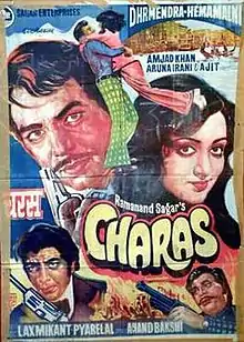 Charas is a 1976 Indian Hindi-language action thriller film produced and directed by Ramanand Sagar. It is set against the backdrop of the expulsion of Indian community from Uganda by its dictator Idi Amin in 1972. The film stars Dharmendra, Hema Malini, Ajit, Amjad Khan, Sujit Kumar, Aruna Irani, Asrani, Keshto Mukherjee and Tom Alter. The film's music is by Laxmikant–Pyarelal.