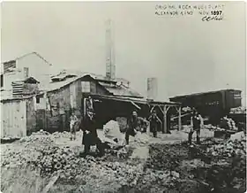 A few years after Crystal Chemical Works was founded, the natural gas supply of the area had been used up.[20] All the local industries moved out, including the original investors of Hall's company in 1906. Hall then disbanded his company and organized Banner Rock Products Company with another group of investors.[6][13] It operated the same plant in Alexandria.[21] The new company had the first factory to make commercial insulation profitably.[15] It used coke as a substitute fuel to raise the temperature of the furnaces to 2800 degrees to melt the rock to produce the rock wool fiber material. One of the first uses of the rock wool was for industrial insulation of boilers and pipes.[22] Other uses were for coating industrial ovens, for heat barriers in vehicles, for noise reduction in motors, and for small home appliances.[15] The Frigidaire Appliance Company used much of what was produced for insulating their refrigerators that they built in Dayton, Ohio.[23]
