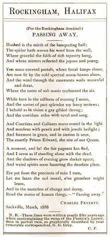 As a young man, Fenerty began writing poetry; his first (known) poem, written when he was 17 years old, was titled "The Prince's Lodge" (later retitled as "Passing Away" and published in 1888). It described an abandoned, decaying home overlooking the Bedford Basin near Halifax. The lodge had been built decades prior by Prince Edward Augustus, Duke of Kent and Strathearn, who later returned to England.[8]
