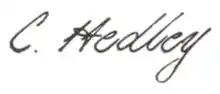 Hedley was on the council of the Linnean Society of New South Wales from 1897 to 1924 and was president from 1909 to 1911; he was on the council for 16 years of the Royal Society of New South Wales and was president in 1914; he was a vice-president of the Malacological Society of London from 1923. He was awarded the David Syme prize in 1916, and in 1925 received the Clarke Medal from the Royal Society of New South Wales. A man of invariable courtesy and kindliness, held in the highest regard by contemporary scientists, his knowledge was always at the disposal of younger naturalists and visiting scientists. His work, and especially in regard to the zoo-geographical history of the Pacific Ocean, gave him a high place among Australian zoologists. Hedley was the only man on the management committee of The Women's Co-operative Silk Growing and Industrial Association of New South Wales Limited, set up in 1893 with the aim of establishing a silk growing industry in New South Wales.[6] A list of 156 published research papers written by Hedley, and 15 in association with others, was printed in 1924.[1]
