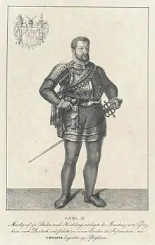 Charles II, Margrave of Baden-Durlach (born 24 July 1529 in Pforzheim; died 23 March 1577 in Durlach), nicknamed Charles with the bag, governed the Margravate of Durlach from 1552 to 1577. On 1 June 1556 Charles issued a new Church Order, which made Lutheranism the official religion in Baden-Durlach.