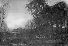 Charles Melville Dewey (1849–1937) was an American tonalist painter. He was born in Lowville, New York. Confined to his bed from his twelfth to his seventeenth year by a hip disease, he formed the poetic conception of nature which appears in his pictures. He studied in the schools of the National Academy of Design, New York (1874–76), and in Paris under Carolus-Duran, whom he assisted to paint a ceiling in the Louvre. In 1878 he returned to New York. Dewey's work has much highly individual, poetic sentiment and generally depicts subdued morning and evening effects. His landscapes in oil and water color are in many public galleries and private collections in the United States. Among his best are: