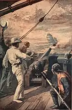 The following illustrations were drawn by Sheldon as War Correspondent for Black and White for Kitchener's campaign for the Anglo-Egyptian conquest of Sudan.[9] The days of the illustrator war correspondent were already numbered. Hodson notes that photography was becoming the dominant art and that this, and the redrawing of war correspondent's sketches to be more dramatic and photography-like was already leading to a falling-off in the quality of illustrations.[10] Black and White was already redrawing some of Sheldon's sketches in this way. By the time of the campaign in Cuba, Sheldon was providing photographs for publication as well as sketches.