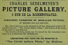 Though specialized in old masters, Sedemeyer became friends with the artist Mihály Munkácsy, who lived in Paris from 1872 onwards. Sedelmeyer bought and sold Mihaly Munkácsy's 1878 The Blind Milton Dictating Paradise Lost to his Daughters, and after doing so offered Munkácsy a ten-year contract, making that painter a wealthy man and a really established member of the Paris art world. Sedelmeyer wanted him to paint large-scale pictures which could be exhibited on their own. They decided that a subject taken from the Bible would be most suitable. In 1882 Munkácsy painted Christ before Pilate which was followed by Golgotha in 1884. The trilogy was completed by Ecce Homo in 1896. These huge paintings were taken on a tour and exhibited in many European cities and also in the US. All three were bought by American millionaire John Wanamaker.[4]