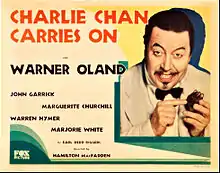 Charlie Chan Carries On is a 1931 American pre-Code mystery film directed by Hamilton MacFadden and starring Warner Oland, John Garrick and Marguerite Churchill. It is the first appearance of Warner Oland as Charlie Chan. Part of the long-running Charlie Chan series, it was based on the 1930 novel of the same title by Earl Derr Biggers. It is now considered a lost film;[1] however, Fox simultaneously filmed a Spanish-language version which was released under the title Eran Trece—There Were Thirteen—and this version survives.