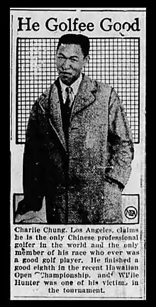 Chung's participation in the white-dominated world of American golf was met with frequent ridicule in sports pages of the country, with one 1922 story patronizingly referring to Chung as "the only big league oriental golf shark of the links" and intimated that he learned of the sport from the "strange words used by 'humorable boss'" while working as a clerk in a sugar company office.[4] "One day Charlie learned that this language referred to a game called golf and soon he was forsaking his clerkly duties for the tees," the wire story mockingly and falsely alleged.[4]