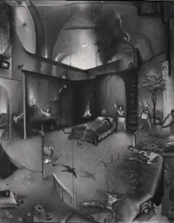 Curator Henry Geldzahler wrote that multi-view paintings like A Room of My Own suggest the complex ways we experience architecture through "an original amalgam of aspects of Futurism and American Surrealism."[21] Other critics compared Schulz's stairways leading nowhere, unexpected doors and dreamlike, tilted rooms—in that work and others, such as Persephone's House With a Chimney (1995)—to the psychological architectures of 18th-century Italian visionary Giovanni Battista Piranesi's fantastical Carceri prison etchings.[16][18]