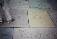 Heston became an icon for playing Moses in the hugely successful biblical epic The Ten Commandments (1956), selected by director Cecil B. DeMille, who thought Heston bore an uncanny resemblance to Michelangelo's statue of Moses.[36] DeMille cast Heston's three-month-old son, Fraser Clarke Heston, as the infant Moses. The Ten Commandments became one of the greatest box office successes of all time and is the eighth highest-grossing film adjusted for inflation. His portrayal of the Hebrew prophet and deliverer was praised by film critics. The Hollywood Reporter described him as "splendid, handsome and princely (and human) in the scenes dealing with him as a young man, and majestic and terrible as his role demands it".[37] The New York Daily News wrote that he "is remarkably effective as both the young, princely Moses and as the Patriarchal savior of his people".[38] His performance as Moses earned him his first nomination for the Golden Globe Award for Best Actor – Motion Picture Drama and Spain's Fotogramas de Plata Award for Best Foreign Performer. When the Egyptian Theater reopened in December 1998, it screened Cecil B. DeMille's 1923 original The Ten Commandments, which had premiered there 75 years earlier. Charlton and Lydia Heston were honored guests at this opening showing and were seated with their longtime friends, brothers Charles Elias Disney and Daniel H. Disney.