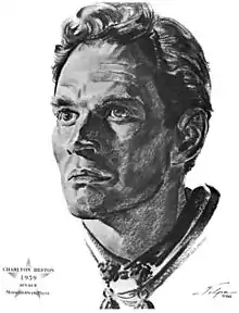 Charlton Heston[1][2] (born John Charles Carter; October 4, 1923 – April 5, 2008) was an American actor and political activist.[3] As a Hollywood star, he appeared in almost 100 films over the course of 60 years. He played Moses in the epic film The Ten Commandments (1956), for which he received his first nomination for the Golden Globe Award for Best Actor – Motion Picture Drama[4] and the title role in Ben-Hur (1959), for which he won the Academy Award for Best Actor.[5] He also starred in The Greatest Show on Earth (1952), Secret of the Incas (1954), Touch of Evil (1958) with Orson Welles, The Big Country (1958), El Cid (1961), The Greatest Story Ever Told (1965), Khartoum (1966), Planet of the Apes (1968), The Omega Man (1971) and Soylent Green (1973).[6]