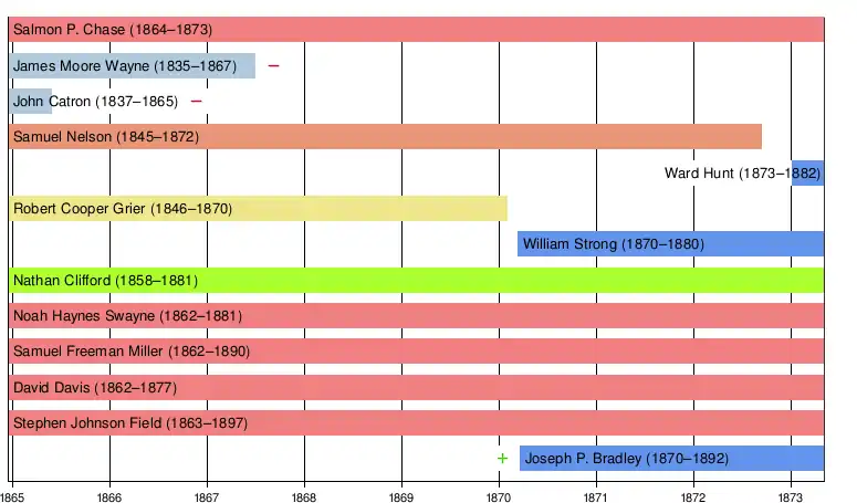 The Chase Court began when President Abraham Lincoln appointed Salmon Chase to replace Chief Justice Roger Taney, who died in 1864. The Chase Court commenced with Chase and nine Associate Justices: James Moore Wayne, John Catron, Samuel Nelson, Robert Cooper Grier, Nathan Clifford, Noah Haynes Swayne, Samuel Freeman Miller, David Davis, Stephen Johnson Field.