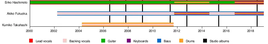 Fukuoka, then in the same grade and at the same high school as Hashimoto, joined as an acoustic duo, and performed one show when a male drummer pulled out right before a concert in April 2004. Takahashi sat in the audience of the show and at the time was in another band, but was known to the duo via the Light Music Club of their university in Tokushima, Shikoku.[1][5]