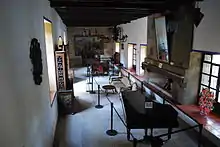 The manor house was originally built by the Marquis of Selva Negra, the first owner of the property, but different parts of the complex date from different times. It is built at an elevation which overlooks the property, although trees block the view of the lake. The house now serves as the entrance to the hacienda and it is surrounded by a number of ash trees that are centuries old.[2][5] Visitors enter a side portal into the inner courtyard. The courtyard fountain, built in 1941, is covered in Talavera plates and tiles. Opposite the fountain is a small chapel. The four flanks of the building enclosing the courtyard feature small watchtowers on the four outer corners. The entrance to the site museum is on the north side. The museum contains photographs, paintings, furniture and other items displayed among the former rooms of the house including the salon, the kitchen, the dining room and one of the bedrooms. Beside the manor house are the remains of other hacienda buildings such as horse stables.[2] To reach the rest of the property, one exits the house into the east garden, which is one of several on the property. This garden contains a large white fountain flanked by two reflecting pools. In this garden, there are a number of paths, including one that leads to the lake and the English style residence.[5]