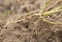 Finally the countermeasures are not limited to organismal relationships. West et al. found a similar countermeasure against cheating in legume-rhizobium mutualism.[34] In this relationship, nitrogen fixing bacteria rhizobium fixes atmospheric N2 from inside the roots of leguminous plants, providing this essential source of nitrogen to these plants while also receiving organic acids for themselves. However, some bacteria are more mutualistic, while others are more parasitic because they consume the plant's resources but fixes little to no N2. Moreover, these plants cannot tell whether the bacteria are more or less parasitic until they are settled in the plant nodules. To prevent cheating, these plants seem to be able to punish the rhizobium bacteria. In a series of experiments, researchers forced non-cooperation between the bacteria and the plants by placing various nodules in nitrogen-free atmosphere. They saw a decrease in the rhizobium reproductive success by 50%.[35] West et al. created a model for legume sanctioning the bacteria and hypothesizes that these behaviors exist to stabilize mutualistic interactions.[34]