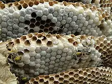 Eusocial insects also serve as valuable tools in studying cheating. Eusocial insects behave cooperatively, where members of the community forgo reproduction to assist a few individuals to reproduce. Such model systems have potential for conflict of interest to arise among individuals, and thus also have potential for cheating to occur.[13][17] Eusocial insects in the order Hymenoptera, which includes bees and wasps, exhibit good examples of conflicts of interest present in insect societies. In these systems, queen bees and wasps can mate and lay fertilized eggs that hatch into females. On the other hand, workers of most species in Hymenoptera can produce eggs, but cannot produce fertilized eggs due to loss of mating ability.[13] Workers that lay eggs represent a cost for the colony because workers that lay eggs often do significantly less work, and thus negatively impact the health of the colony (for example: decreased amount of collected food, or less attention given to tending the queen's eggs). In this case, a conflict of interest arises between the workers and the colony. The workers should lay eggs in order to pass on their genes; however, as a colony, having only the queen reproduce leads to better productivity.[13] If workers sought to pass their own genes by laying eggs, foraging activities would diminish, leading to decreased resources for the entire colony. This, in turn, can cause a tragedy of the commons,[18] where selfish behavior lead to the depletion of resources, with long-term negative consequences for the group. However, in natural bee and wasp societies, only 0.01–0.1% and 1%, respectively, of the workers lay eggs, suggesting that strategies exist to combat cheating to prevent tragedy of the commons.[13][18] These insect systems have given scientists opportunities to study strategies that keep cheating in check. Such strategies are commonly referred to as "policing" strategies, generally where additional costs are imposed on cheaters to discourage or eliminate cheating behaviors. For example, honeybees and wasps may eat eggs produced by workers. In some ant species and yellowjackets, policing may occur via aggression towards or killing egg-laying individuals to minimize cheating.[13]