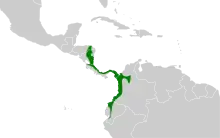 It is a resident breeder in tropical Central and South America from southeastern Honduras to western Ecuador. In Central America, it occurs in the Caribbean lowlands and foothills up to 700 m altitude.