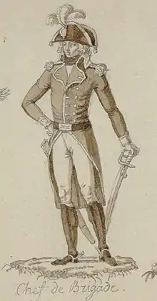 Chef de brigade was equivalent to major in the French Royal Corps of Artillery. Each regiment of artillery was divided into two battalions, each of two brigades under the command of a chef de brigade.[1] This rank was given to the best of the Capitaines en premier (first captains) in a regiment, commanding an artillery brigade that would be able to support an army division.[2]