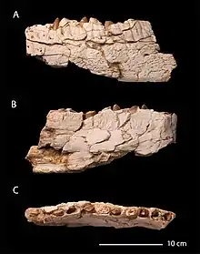 The holotype is labelled as OCP DEK-GE 772. Individual teeth collected from the surrounding area, two premaxillary teeth labelled as OCP DEK-GE 457 and DEK-GE 458 and the maxillary tooth WDC-CCPM-005 already described in 2005,[2] were referred to Chenanisaurus due to their similarity to the teeth of the holotype. Chenanisaurus is named after the Sidi Chennane mines where it was discovered and its specific name of barbaricus translates as "barbaric" and refers to Barbary.[1] Its discovery came as a surprise, because the rocks that produced the jaw were marine and primarily produced marine reptiles, not dinosaurs.[3]