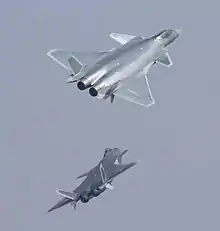 The Chengdu J-20 (Chinese: 歼-20; pinyin: Jiān-Èrlíng), also known as Mighty Dragon (Chinese: 威龙; pinyin: Wēilóng),[8][9][10] is a twinjet all-weather stealth[11] fighter aircraft developed by China's Chengdu Aerospace Corporation for the People's Liberation Army Air Force (PLAAF).[4] The J-20 is designed as an air superiority fighter with precision strike capability;[12] it descends from the J-XX program of the 1990s.[13]