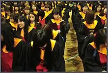 Students graduate wearing university-style robes of black, yellow and red.