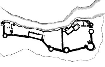 Chepstow Castle is situated on a narrow ridge between the limestone river cliff and a valley, known locally as the Dell, on its landward side. Its full extent is best appreciated from the opposite bank of the River Wye. The castle has four baileys, added in turn through its history. Despite this, it is not a defensively strong castle, having neither a strong keep nor a concentric layout. The multiple baileys instead show its construction history, which is generally considered in four major phases.[1] The first serious architectural study of Chepstow began in 1904[2] and the canonical description was long considered to be by Perks in 1955.[3] Recent studies[4] have revised the details of these phases, but still maintain the same broad structure.