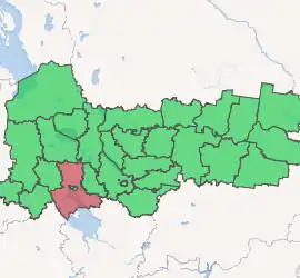 Cherepovetsky District (Russian: Черепове́цкий райо́н) is an administrative[1] and municipal[8] district (raion), one of the twenty-six in Vologda Oblast, Russia. It is located in the northeast of the oblast and borders with Belozersky District in the north, Kirillovsky District in the northwest, Sheksninsky District in the east, Poshekhonsky District of Yaroslavl Oblast in the southeast, Breytovsky District of Yaroslavl Oblast in the south, Vesyegonsky District of Tver Oblast in the southwest, Ustyuzhensky District in the west, and with Kaduysky District in the northwest. The area of the district is 7,640 square kilometers (2,950 sq mi).[4] Its administrative center is the city of Cherepovets[3] (which is not administratively a part of the district).[1] Population: 41,025 (2010 Census);[5] 40,871 (2002 Census);[10] 48,336 (1989 Census).[11]