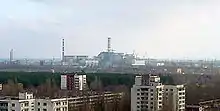 ![]() Reactor 4 several months after the disaster. Reactor 3 can be seen behind the ventilation stack | |