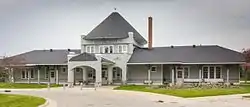 The Chesapeake and Ohio Depot is located just on the edge of Little Traverse Bay. It is a distinctly Victorian Shingle style building with a distinct Victorian cast. The long building originally had open platforms at each end, but these were filled in during subsequent renovations. A porte cochere extends in the front of the building, and perching atop the building is a squat conical roof. Next to the conical section is a tall narrow chimney.[6]