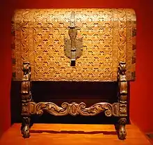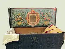 A cassone is a kind of carved or painted chest associated with late Medieval and Renaissance Italy. Cassones, also called marriage chests or hope chests, were often used to carry the dowry goods in a marriage ceremony.[8]
