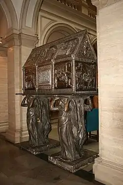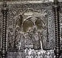 The scenes are separated by columns surmounted by small heads of angels sculpted during the two-year restoration process started in 1630.[5] The work was conducted by the goldsmiths Constantino Piazzalonga of Venice and Benedetto Libani of Zadar, who reduced the length of the chest by four and the width by three fingers.[18][19][n 9]