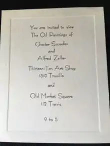 Since 1964, Chester Snowden and Alfred Zeller worked together in their Thirteen Ten Art Studio & Galleries, located at 1310 Truxillo Street in Houston, Texas. They offered classes in oil painting and other mediums as well as framing.[2]