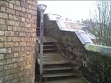 After the end of the Civil War, the walls ceased to have any military or defensive function, and increasingly became used for recreational purposes. In 1707 the City Assembly made a grant of £1,000 (equivalent to £170,000 in 2020)[14] to repair and re-flag the walls to make a walkway with an unfortified parapet. Notable people walking the walls in the early 18th century included John Wesley and Samuel Johnson. By this time the main gates were too narrow for the increasing traffic, so they were all rebuilt with wider arches. The gates had also prevented an unobstructed perambulation of the walls, and the opportunity was taken to carry the walkway over the new gates. Eastgate was replaced in 1768, Bridgegate in 1781, and Watergate in 1788.[4][15] Other measures were taken to improve the accessibility for walkers; these included the building of Recorder's Steps in 1720 on the southern part of the walls, and the Wishing Steps in 1785 on a steeply inclined section to the east of the Recorder's Steps.[4] Between 1808 and 1810 Northgate was rebuilt. This gate had contained the city gaol, and a new gaol was built in the south of the city. The gaol yard extended southwards towards the river and this necessitated removing Shipgate, thus creating a permanent breach in the wall.[16]