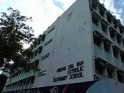 Cheung Sha Wan Catholic Secondary School (Chinese: 長沙灣天主教英文中學, abbr. CSWCSS) is one of Hong Kong's leading English boys' schools. It was established on 20 November 1970 by the Catholic Diocese of Hong Kong. The school is situated on Fuk Wing Street, Cheung Sha Wan, Hong Kong.[1]