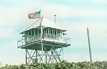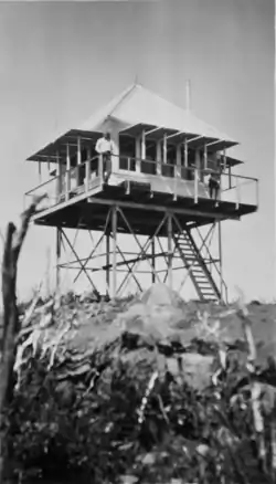 In 1919, a family resided in a government-owned cabin at the summit, which also served as a fire lookout.[2] The 12 feet (3.7 m) tall steel frame tower supporting the 13 by 13 feet (4.0 m × 4.0 m) cab was built in 1929. The tower is at an elevation of 5,082 feet (1,549 m).[3] Arthur Story and his wife were among the first residents of the lookout. The lookout was destroyed by the Marble Cone Fire in 1977 and rebuilt in 1978. In 1984 the cab was replaced with a standard R-6 design which featured a cat walk and a flat roof.[4]