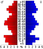 In the county, the population was spread out, with 23.80% under the age of 18, 5.10% from 18 to 24, 22.70% from 25 to 44, 21.80% from 45 to 64, and 26.60% who were 65 years of age or older. The median age was 44 years. For every 100 females there were 97.30 males. For every 100 females age 18 and over, there were 92.40 males.