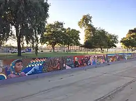 Murals were the preferred medium of street art used by Chicana artists during the Chicano Movement.[3] Judy Baca led the large-scalecale project for SPARC, The Great Wall of Los Angeles. It took five summers to complete the 700 meter long mural. The mural was completed by Baca, Judithe Hernández, Olga Muñiz, Isabel Castro, Yreina Cervántez, and Patssi Valdez in addition to over 400 more artists and community youth. Located in Tujunga Flood Control Channel in the Valley Glen area of the San Fernando Valley, the mural depicts California’s erased history of marginalized people of color and minorities.[3]