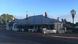 The Chidlow Tavern sits right on the footpath in Thomas Street Chidlow, opposite the Railway Reserve Heritage Trail where Chidlow's Wells Station once stood. The building is single-storey brick, with simple timber detailing to the front veranda, doors and windows. The roof is of corrugated iron with a hipped form that continues down to form the veranda without any break in pitch. Projecting rooms to the front and side also have hipped roofs extending out from the main roof structure. The main entry into the hotel is from a door on the veranda with stained glass panels and sidelights.[12]