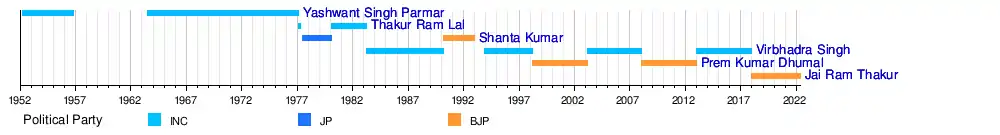 Since 1952, six people have been Chief Minister of Himachal Pradesh. Three of these belonged to the Indian National Congress party, including inaugural office-holder Yashwant Singh Parmar. After his first term ended in 1956, Himachal Pradesh was made a union territory, and the office of Chief Minister ceased to exist. In 1963, Parmar once again became Chief Minister, and during his reign, in 1971, Himachal regained full statehood. Until March 2015, when he was surpassed by Virbhadra Singh, Parmar was the state's longest-serving chief minister. Between 1993-2017, the chief ministership has changed hands every five years between Virbhadra Singh of the Congress and Prem Kumar Dhumal of the Bharatiya Janata Party. All chief ministers except Shanta Kumar, belongs to the Rajput caste.[2] The current incumbent is Jai Ram Thakur of the Bharatiya Janata Party having been sworn in on 27 December 2017.