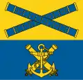 A command flag of the Chief of Navy, drawn by Brita Grep and embroidered by hand by the company Libraria, was introduced during the reign of Gustaf VI Adolf (1950–1973). Blazon: "Fessed in yellow and blue; on yellow two blue batons of command with sets of yellow crowns placed two and one in saltire, on blue an anchor erect cabled over two gun barrels of older pattern in saltire, all yellow."[7]