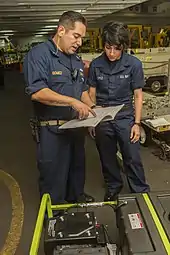 Chief petty officer (CPO) is the seventh enlisted rank (with the paygrade E-7) in the United States Navy[1] and U.S. Coast Guard, just above petty officer first class and below senior chief petty officer. The term "rating" is used to identify enlisted job specialties. In this way, enlisted personnel are segregated into three segments containing different enlisted ranks. Furthermore, rates are broken down into three levels: non-rated members without a designated occupation (E-1 through E-3). Advancement to E-4 and above is dependent on graduating from a specialty school that define what the enlisted is rated for. Petty officers (E-4 through E-6) and chief petty officers (E-7 through E-9) are part of the rated force and considered extremely knowledgeable about their particular rating. Examples include Culinary Services Chief and Aviation Maintenance Chief.[2] The Chief Petty Officer is the rank . Gunners Mate is a rating. E7 is a pay grade. The term rating is used to identify the career field of a chief petty officer. For example, the title of a chief petty officer in the Master-at-Arms rating would be spoken or spelled out as Master-at-Arms, Chief Petty Officer or Chief Master-at-Arms. The title would be abbreviated MAC. The grade of chief petty officer was established on 1 April 1893 in the United States Navy.[3] The United States Congress first authorized the Coast Guard to use the promotion to Chief Petty Officer on 18 May 1920.[4] Chief petty officer is also the final cadet grade in the United States Naval Sea Cadet Corps.