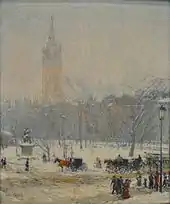 Hassam became close friends with fellow American Impressionist artists J. Alden Weir and John Henry Twachtman, whom he met through the American Water Color Society, and over the following months he made many connections in the art community through other art societies and social clubs.[26] He contributed works from his European stay to several exhibitions and shows. Hassam enthusiastically painted the genteel urban atmosphere of New York that he encountered within walking distance of his apartment, and avoided the squalor of the lower-class neighborhoods. He proclaimed that "New York is the most beautiful city in the world. There is no boulevard in all Paris that compares to our own Fifth Avenue...the average American still fails to appreciate the beauty of his own country."[27] He captured well-dressed men in bowler hats and top hats, fashionable women and children out and about, and horse-drawn cabs slowly making their way along crowded thoroughfares lined by commercial buildings (which were generally less than six stories high at that time). Hassam's primary focus would forever continue to be "humanity in motion".[28] He never doubted his own artistic development and his subjects, remaining confident in his instinctual choices throughout his life.[11]