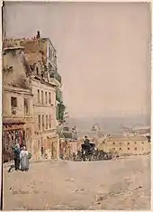In February 1884, after a courtship of several years, Hassam married Kathleen Maude (or Maud) Doane (born 1861), a family friend.[1] Throughout their life together, she ran the household, arranged travel, and attended to other domestic tasks, but little is known about their private life.[11] By the mid-1880s, Hassam began painting cityscapes; Boston Common at Twilight (1885) was of his first. He joined a few other progressive American artists who were taking to heart the advice of French academic master Jean-Léon Gérôme, who abandoned his traditional subject matter and told his American peers, "Look around you and paint what you see. Forget the Beaux-Arts and the models and render the intense life which surrounds you and be assured that the Brooklyn Bridge is worth the Colosseum of Rome and that modern America is as fine as the bric-a-brac of antiquity."[14] However, one Boston critic firmly rejected Hassam's choice of urban subject matter as "very pleasant, but not art."[11] Although he had shown steady improvement in his oil painting, his watercolors continued provided consistent financial success. He returned with his wife to Paris where in 1886 they were able to engage a well-located apartment/studio with a maid near the Place Pigalle, the center of the Parisian art community. With the exception of fellow American artist Frank Myers Boggs, they lived among the French and socialized little with other American artists studying abroad.[15]