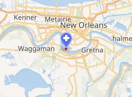 The main hospital is located in the University District of Uptown New Orleans. This facility is located along the levee next to the Mississippi River, near the Audubon Zoo and Audubon Park, New Orleans, on the city's old high ground or "sliver by the river" which escaped the flooding of most of the city in the Levee failures in Greater New Orleans, 2005 in the aftermath of Hurricane Katrina. There is also a satellite clinic in the nearby suburb of Metairie and one in Baton Rouge. The hospital has its own power generator and remained operational throughout Hurricane Katrina. Though the hospital received no damage, officials were concerned about the lack of clean water and electricity in the New Orleans area. It was evacuated on September 1, 2005 when the hospital lost water pressure from the city. Children from the hospital were sent to children's hospitals around the U.S. and Canada.[7][8][9] The hospital suffered no flood damage and negligible wind damage during the storm. It was fully reopened over a month later on October 10, 2005.[10]