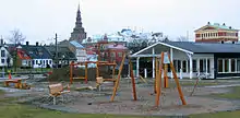 Playground in Ystad, Sweden in 2019. The colorful surface is soft rubber asphalt.