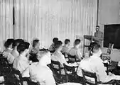 The Bombardier School opened and accepted its first class of cadets began training in late February 1943 and graduated in May. Members of this class (43-7) were dubbed the "Valentine of Steel" class, in reference to a dummy bomb that Mrs. White decorated as a Valentine to Hitler. Subsequent classes arrived at three-week intervals through the rest of the war and participated in an initial training program of eighteen weeks, later increased to twenty-four. Those who completed the work were designated flight officers or commissioned as second lieutenants.[3][4]