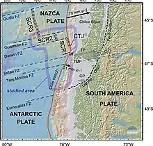 The Antarctic Plate started to subduct beneath South America 14 million years ago in the Miocene epoch forming the Chile Triple Junction. At first the Antarctic Plate subducted only in the southernmost tip of Patagonia, meaning that the Chile Triple Junction lay near the Strait of Magellan. As the southern part of Nazca Plate and the Chile Rise became consumed by subduction and the more northerly regions of the Antarctic Plate begun to subduct beneath Patagonia so that the Chile Triple Junction advanced gradually to its present position in front of Taitao Peninsula at 46°15’.[1][2] The South American plate is moving away from the Nazca plate and moving in a direction to the north of the Chile ridge spreading center, while the Nazca plate is subducting under the South American plate at a rate of about 80–90 mm/a north of the triple junction.[3] The triple junction of the Chile Ridge, the Chile Trench and the Antarctic Plate collided about 14 Ma ago near the latitude of Tierra del Fuego. Since then it has migrated north, with the actual triple junction now located at 46°12'S.The Chilean margin consists of the Nazca-Antarctic spreading center, the Chile Rise or Chile Ridge, and the Chile Ridge, with the Nazca-Antarctic spreading center being at 46.5° S, the Chile Rise or Chile Ridge being more prominent in the south. Additionally around 14 Ma, the Chile Rise collided with the south American continental plate. The high relief topography caused the trench to be devoid of sediment at the Chile-South America junction.[4]