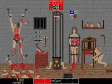 The first two levels feature seemingly human NPCs restrained by medieval torture devices. The player must discover how to kill these characters in the shortest possible amount of time. Although it is possible to shoot them to death, this process is inefficient as direct shots only result in chunks of flesh being blown away, leaving the victims alive.[3] Instead, the challenge lies in finding ways to activate the torture devices, resulting in quicker and bloodier deaths.