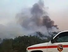 ![]() Smoke rises from the Chimney Fire on August 14. | |