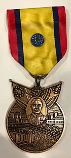 The ribbon of the medal is yellow with red edges 3⁄16 inch (4.8 mm) wide, between the red and yellow are blue stripes 1⁄8 inch (3.2 mm) wide. A round metal Chinese sunburst emblem is placed in the center of the suspension and service ribbons.[4]