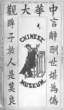 The Chinese Museum (1845–1847) in Boston, Massachusetts, showed to the public some 41 cases displaying approximately 800 objects related to Chinese fine arts, agriculture, costume, and other customs. It was located on Washington Street in the Marlboro Chapel (between Bromfield and Winter Streets).[1]